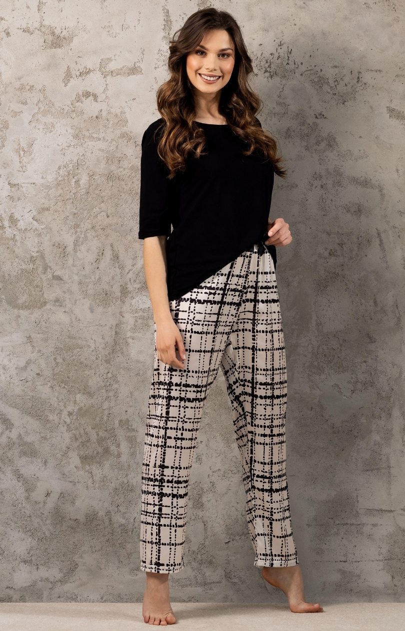Elegant women’s pajamas, also ideal as a gift. The blouse with 3/4 sleeves and a U neckline impresses with its stylish oversize cut, providing comfort and freedom of movement. The loose top harmonizes with the comfortable cut of the long pants, which have an elastic waistband, guaranteeing comfort while sleeping. The pajamas are made of fine viscose and elegant satin, which makes them pleasant to the touch and elegant. The high quality print of the fabric on the pants adds a unique charm to the pajamas. Designed and sewn in Poland, this 2-piece pajama is synonymous with comfort and elegance.