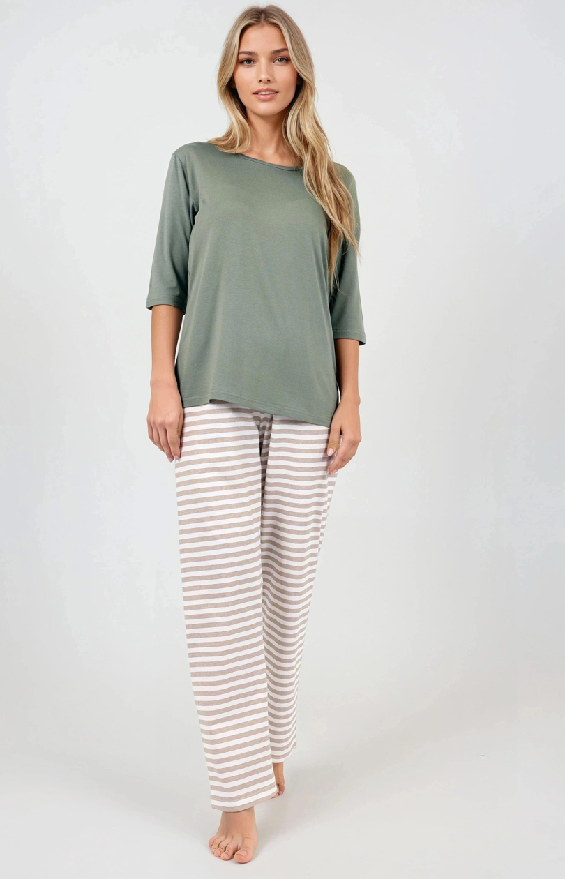 Two-piece pajamas with an elegant style, created with comfort and a feminine look in mind. The round neckline and 3/4 sleeves add subtle charm, while the loose, comfortable fit provides full freedom of movement. The straight leg and wider trouser leg create a harmonious whole, which is not only comfortable, but also elegant. The pajamas are made of natural materials guaranteeing high quality and hypoallergenic properties, making them ideal even for sensitive skin. The elastic waistband ensures that the model fits perfectly to the silhouette, providing comfort throughout the night. Designed and made in Poland, the pajamas are an excellent choice for homewear and as a gift.